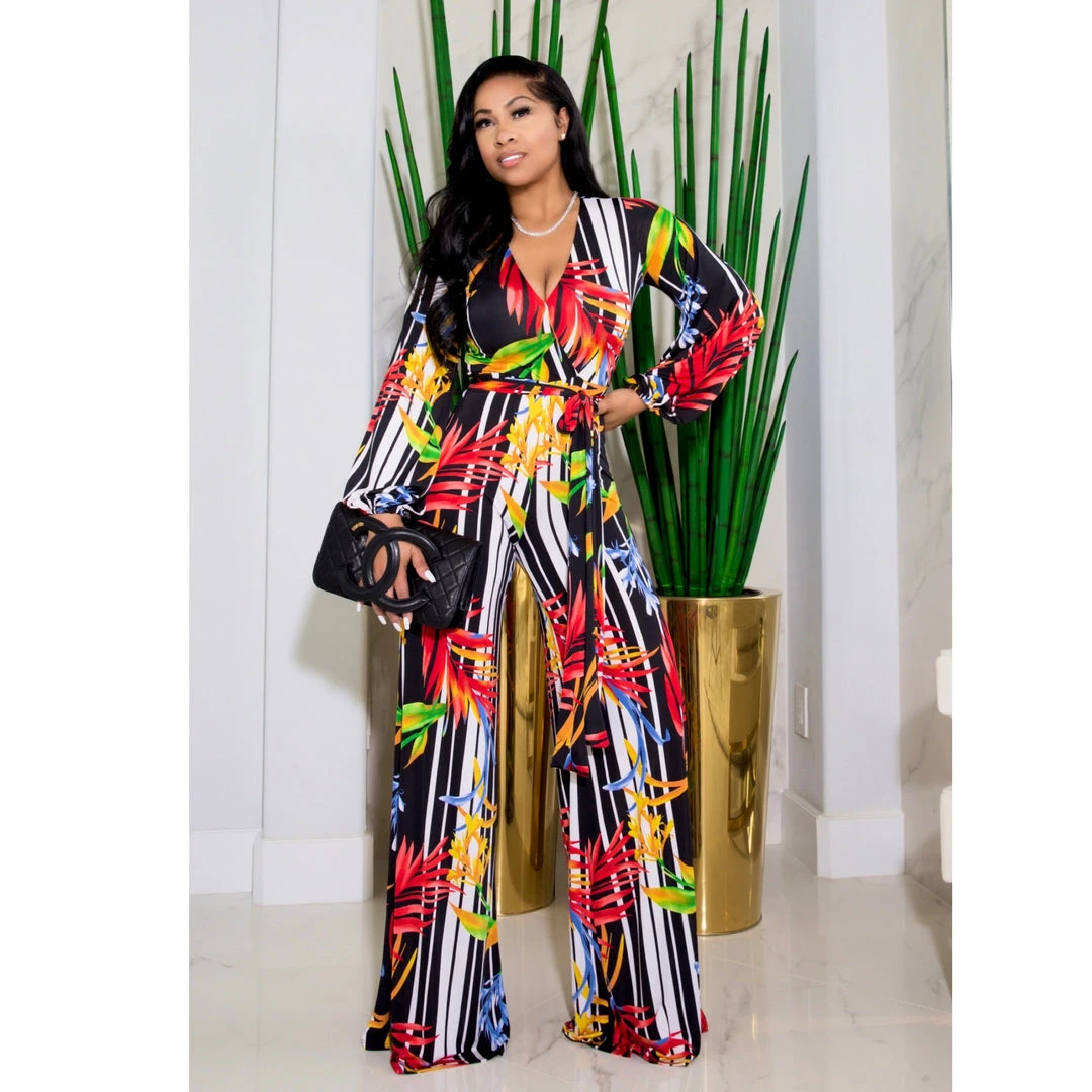 Belted, empire waist, wide leg, super stretch jumpsuit.