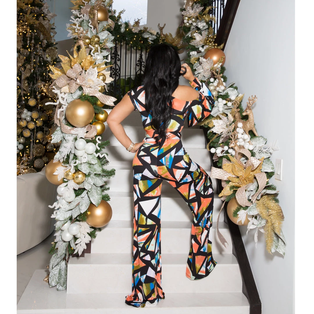 Belted, empire waist, asymmetric stretch jumpsuit.