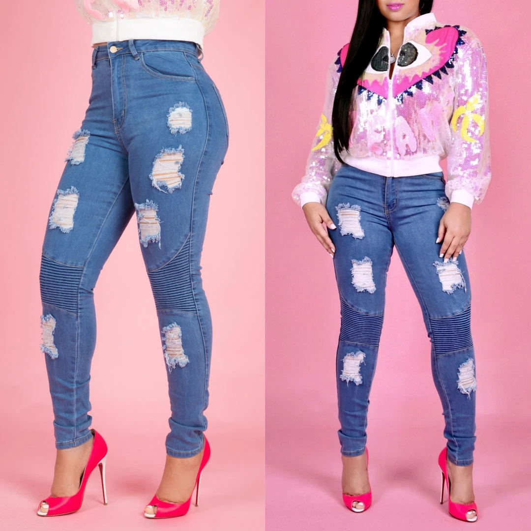 Keep cool and look even cooler in these chic, motorcycle style jeans. Distressed, mid-rise and stretchy. Get the entire look and pair it with our beautiful “Sequin Dream” jacket.