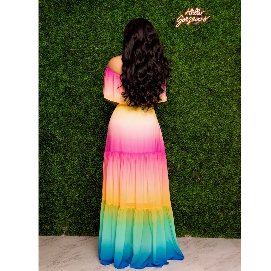 Gorgeous, ombré chiffon dress. Lined, perfectly flowy and topped with a belt. No zippers to fool with, just one button around the neck and a stretchy elastic waistband. An absolute must have!!!!