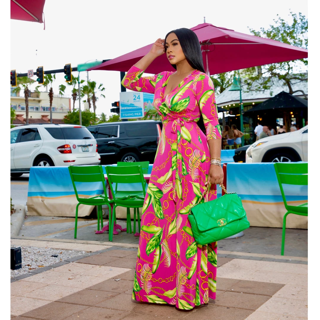 Our favorite wrap dress is back in this beautiful print. Long, beautiful, phenomenal stretch and fits like a dream! Β