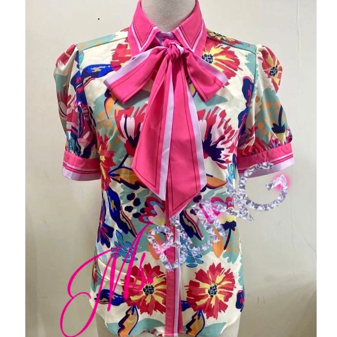 Gorgeous, floral print, 4pc short set. The set includes a short sleeve button down blouse, sash (for bow tie), matching shorts and a gorgeous belt. A must have!Â