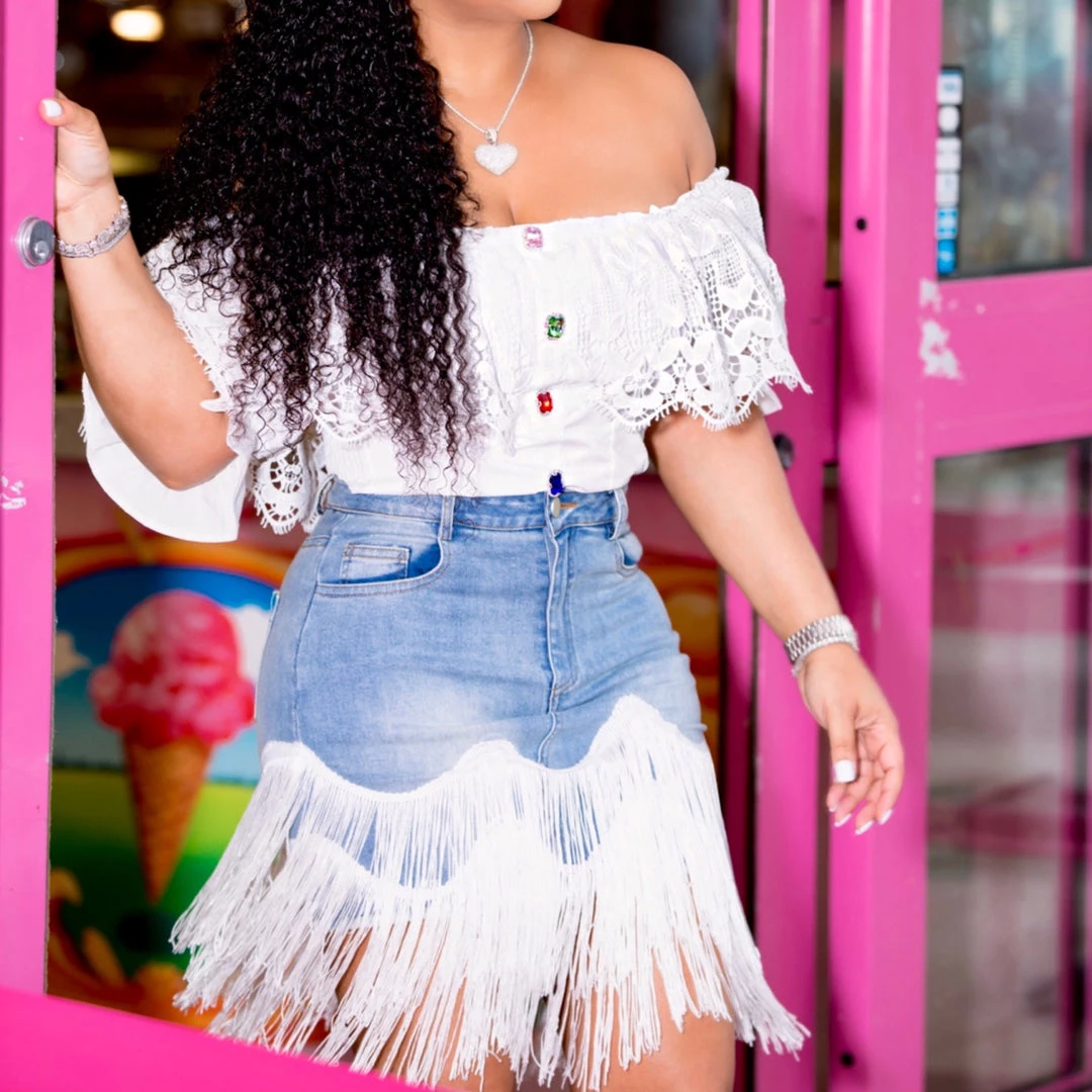 You’ll over love this fabulous fitting, fringe, denim skirt. Get the entire look and pair it our “Dolly” rhinestone blouse.