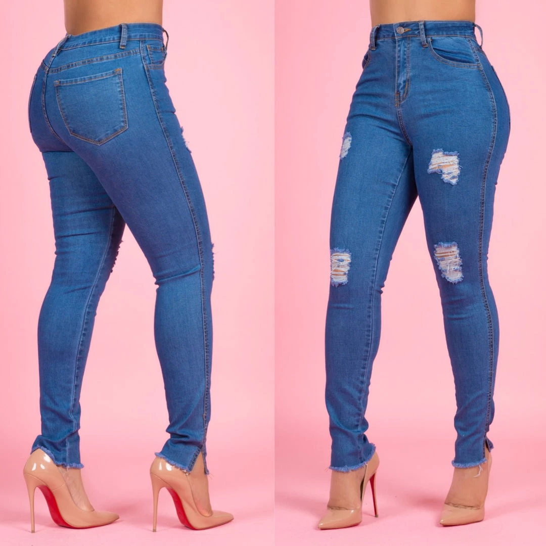 Great fitting distressed mid rise jeans with great stretch. Runs true to size. Get the entire look and pair it with our matching “Tasha” Denim shirt/jacket. A must have!
