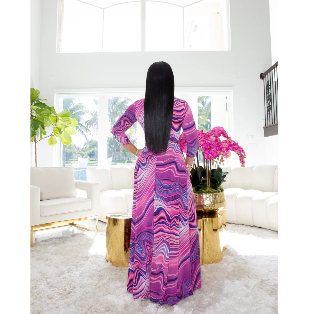 Our favorite wrap dress is back in this beautiful print. Long, beautiful, phenomenal stretch and fits like a dream!
