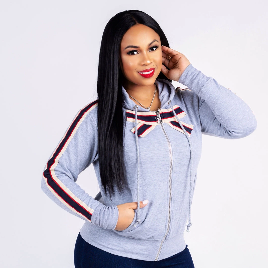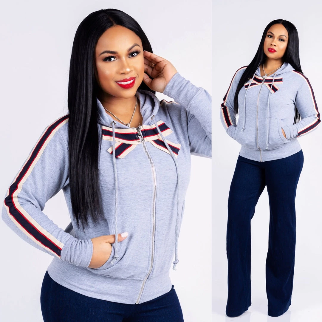 Red and navy has never looked so good. You’ll love this ribbon detailed stretch zip-up hoodie. It’s super cute and my go to and favorite jacket! Perfect for those cold movie theaters and a great jacket to travel with. A must have!
